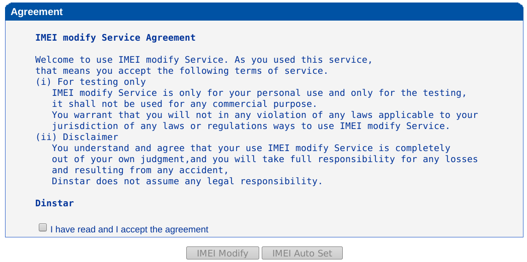Se selecciona el checkbox "I have read and I accept the agreement", y luego "IMEI Auto Set".