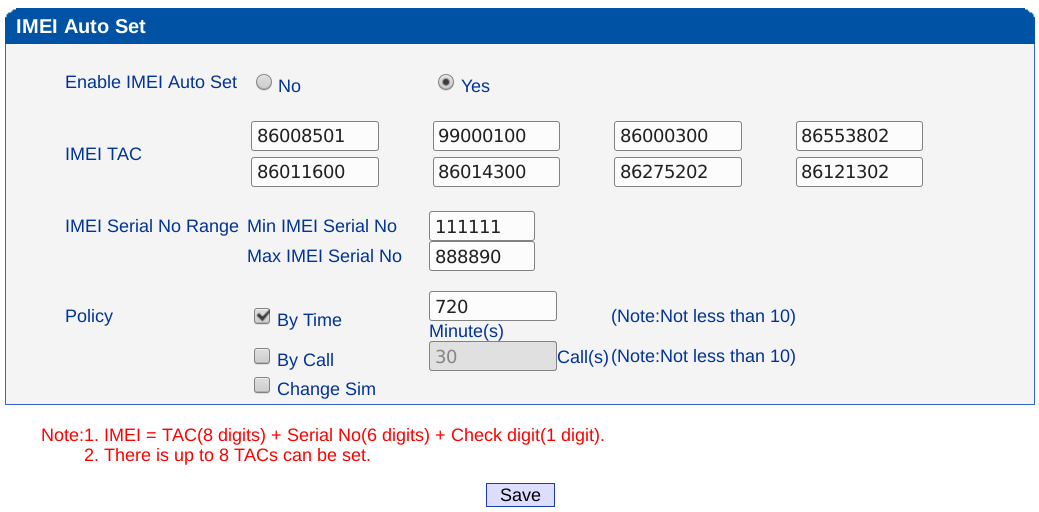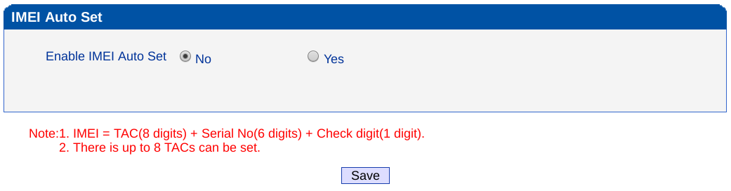 Se selecciona la opción "Enable IMEI Auto Set - Yes", y luego "Save".